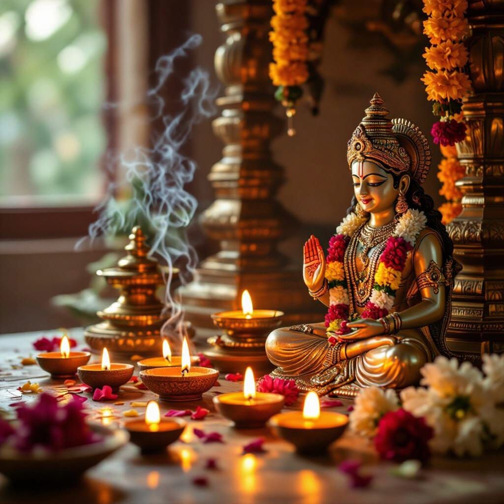 This image shows a Hindu temple corner illuminated by warm light and diyas, with incense smoke and floral decorations. The artwork evokes a sense of calm spirituality in a realist style.