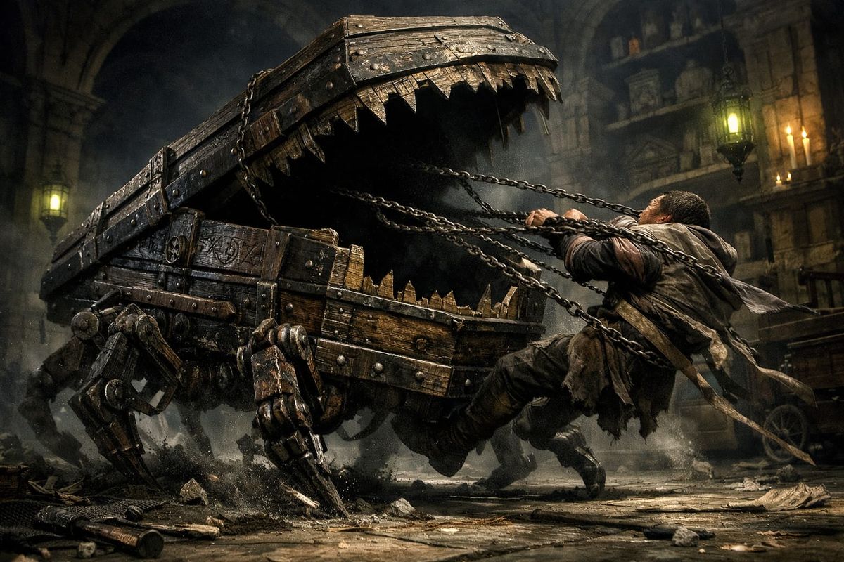 This image depicts an animated coffin, a horrific construct with insect-like limbs, creeping through a grand mortuary. Its lid is open, revealing a dark interior.