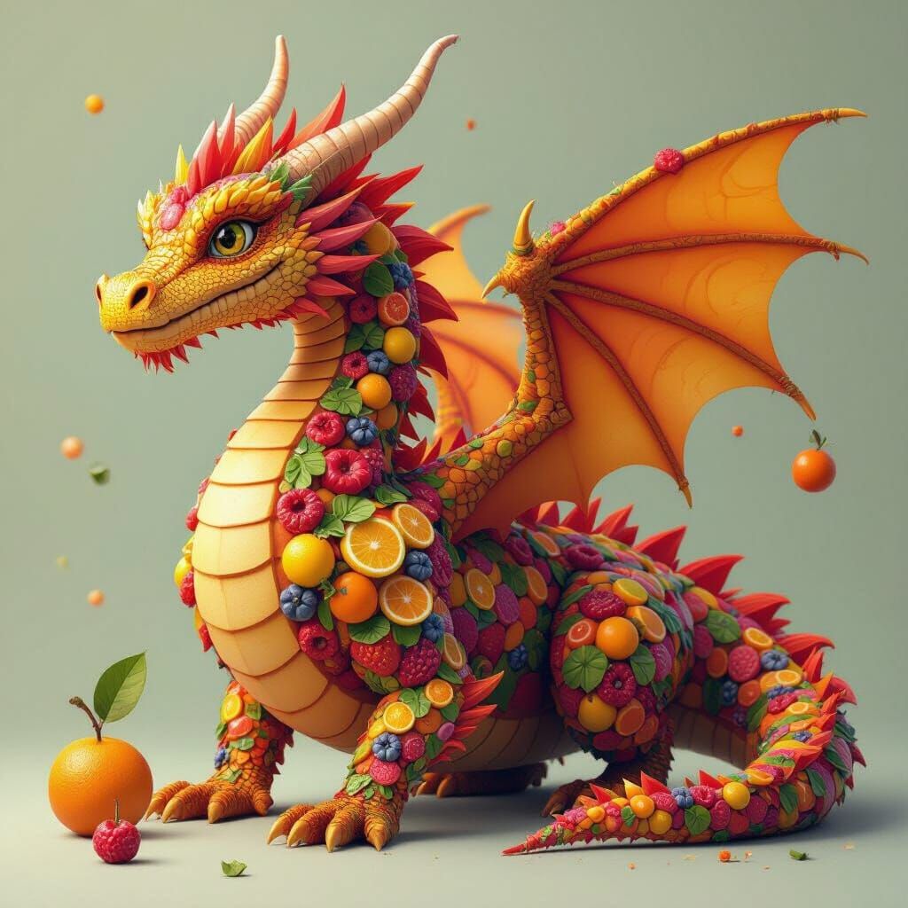 This image shows a whimsical dragon formed from various colorful fruits. The textures are intricate, and the shapes are dynamic, creating a vibrant and juicy mythical creature.