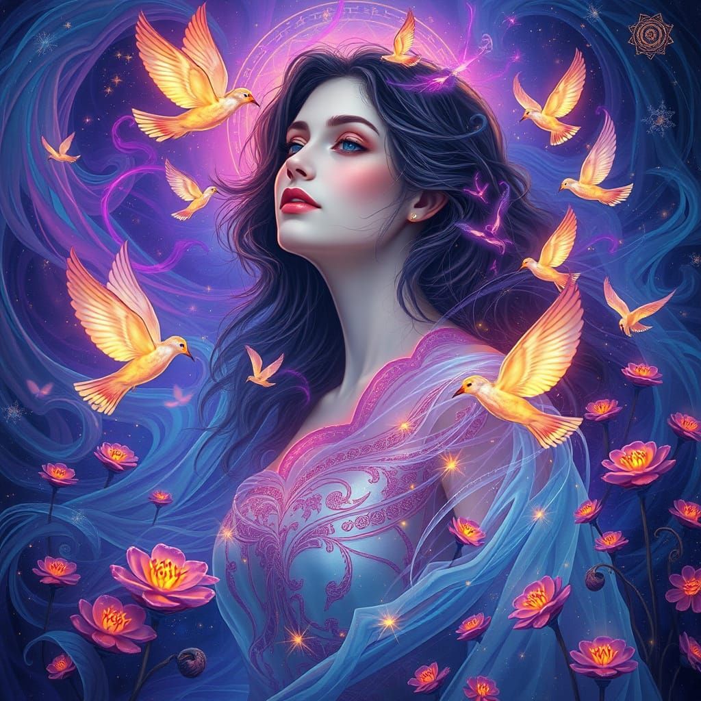 This image depicts an ethereal woman surrounded by glowing, iridescent birds amidst swirling cosmic energy. The art style blends intricate details and vibrant colors for a dreamlike, surreal visual.