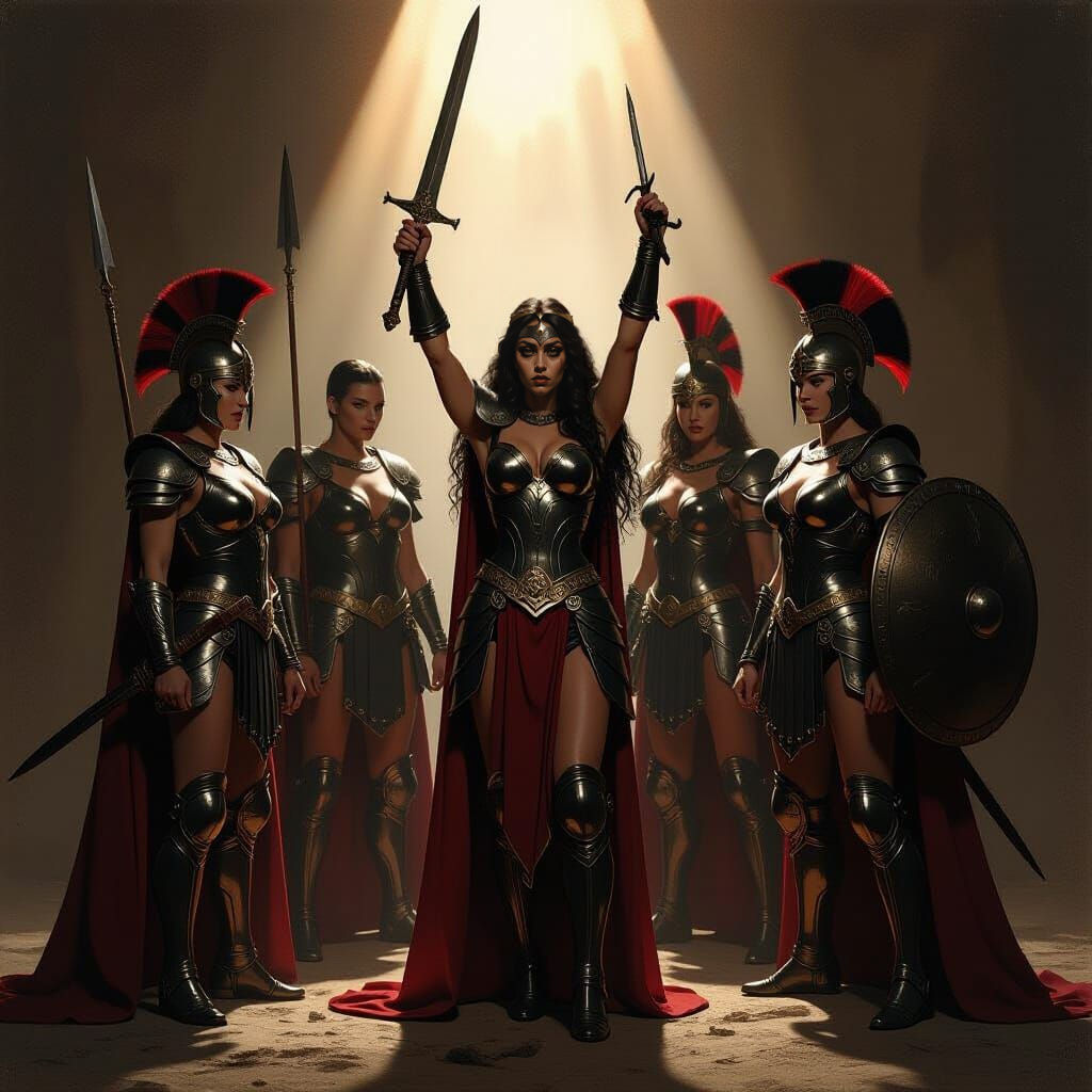 A dramatic painting of Amazon warriors and their queen in leather outfits, employing the artistic technique of chiaroscuro. The artwork features theatrical contrasts of light and shadow.