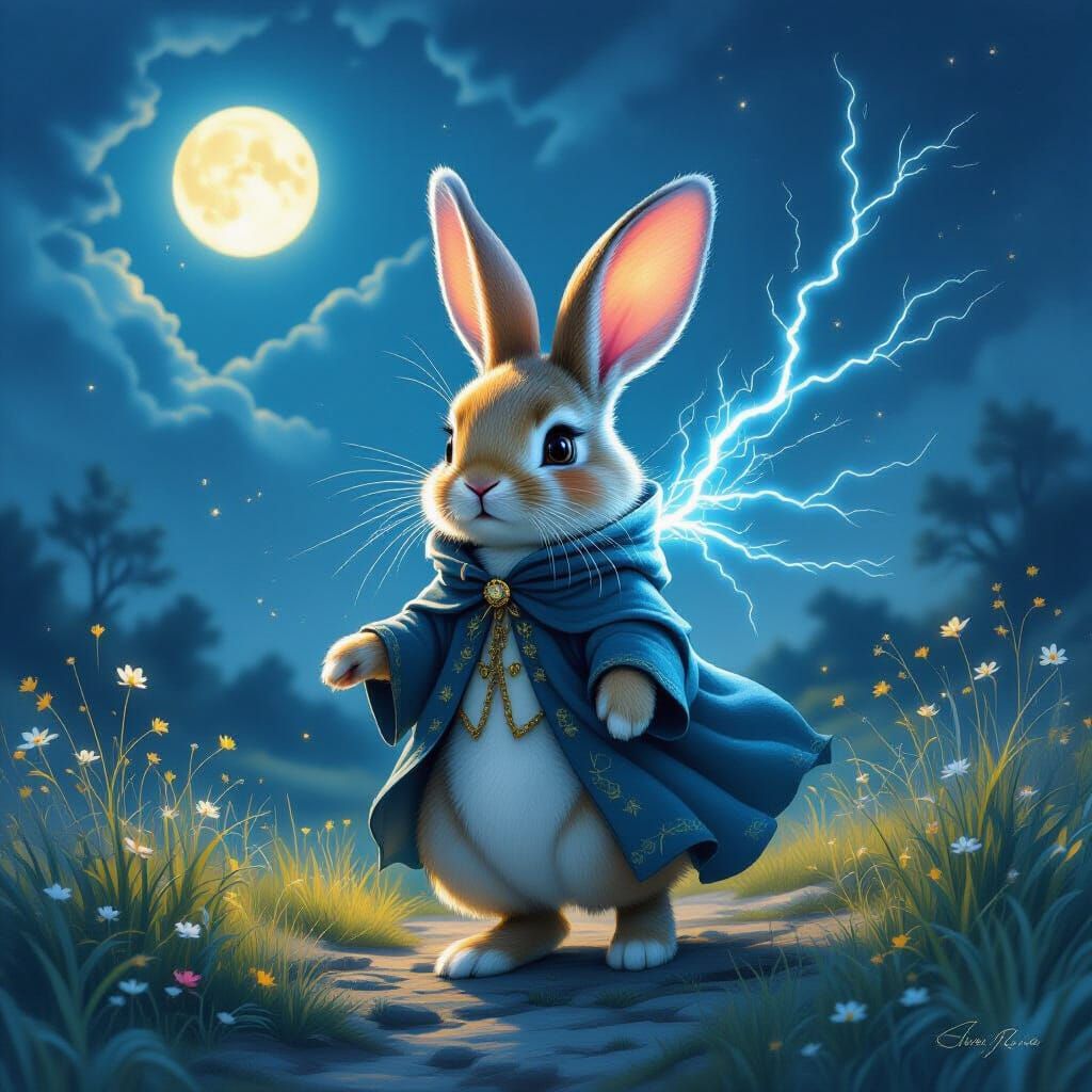 A folkloric rabbit, cloaked in wizardry, stands on a moonlit path surrounded by wildflowers. Its embroidered blue cloak glimmers with golden thread, and from its glowing ears crackle bolts of blue lightning. Beneath a starry sky and full moon, the rabbit channels ancient magic with quiet intensity. This is no ordinary creature—it’s a guardian of mystery, a spark in the meadow, a legend in fur.