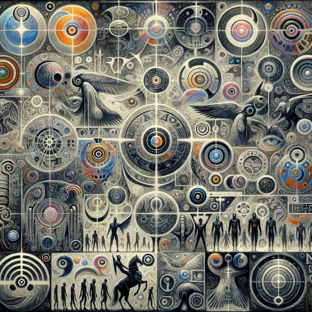 A striking picture of abstract biker culture symbols and figures. The image blends charcoal techniques with neo-impressionistic oil painting and post-impressionist acrylic layering for a mystical aesthetic.