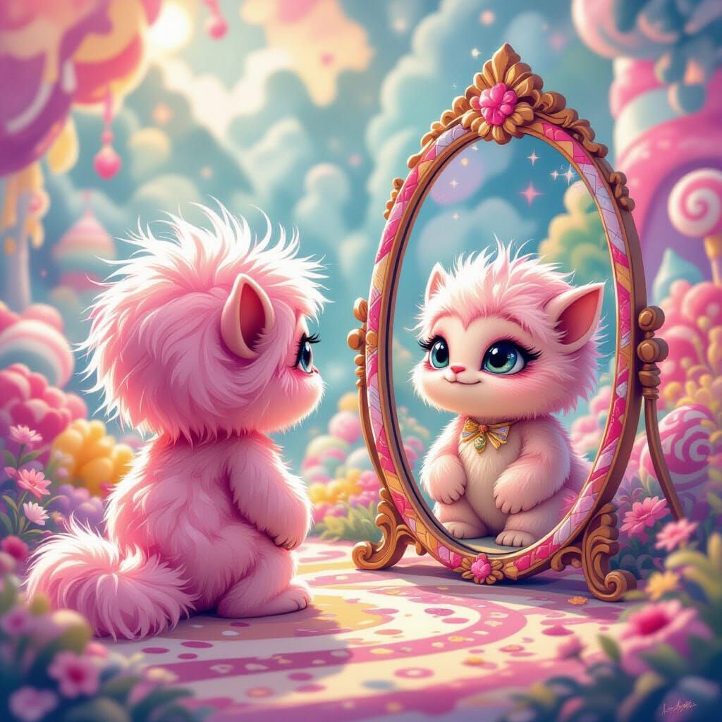 This image features a cute, fluffy pink alien creature looking at its reflection in a mirror. The scene is a vibrant Candyland wonderland with colorful, swirling textures and magical lighting.