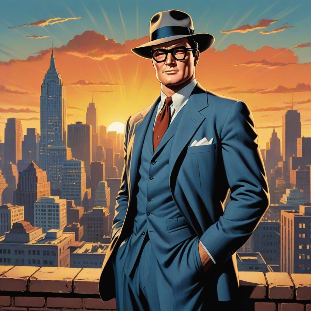 A vintage comic book style image of a man in a double-breasted suit and hat, reminiscent of Clark Kent. The portrait features a metropolitan city at sunset.
