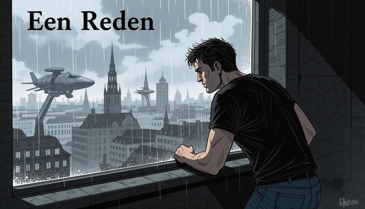 This image shows a man staring out a rain-covered window at a city. The art style evokes a comic book aesthetic with dystopian and surreal elements, rendered with precise lines and moody colors.