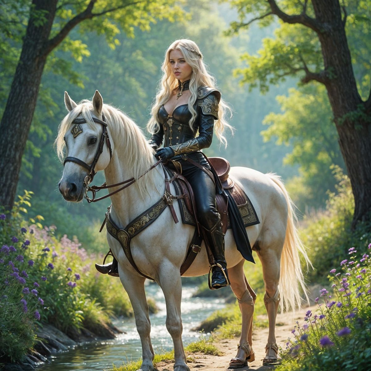 This image depicts a fair-skinned woman with long white hair in dark leather armor, riding a majestic white horse in a sunlit forest. The artwork evokes art nouveau and fantasy painting styles.