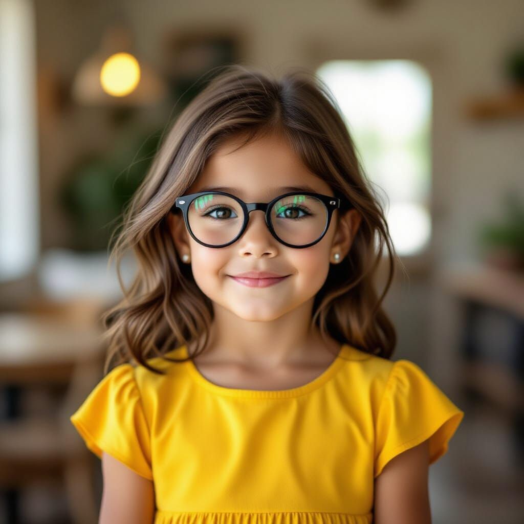This image shows a young girl with dark hair and glasses wearing a bright yellow dress. The portrait captures her youthful features and simple attire.