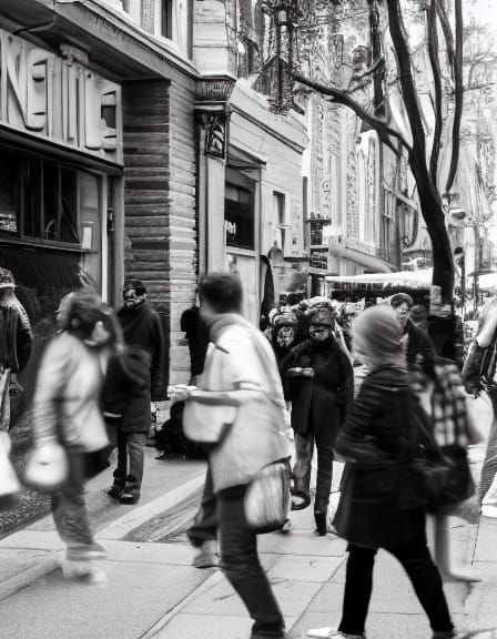 Soft focus, gritty, People walking on city sidewalks in the style of Saul Leiter Vivian Maier Diane Arbus Harold Feinstein Bruce Gilpin in sepia tone
