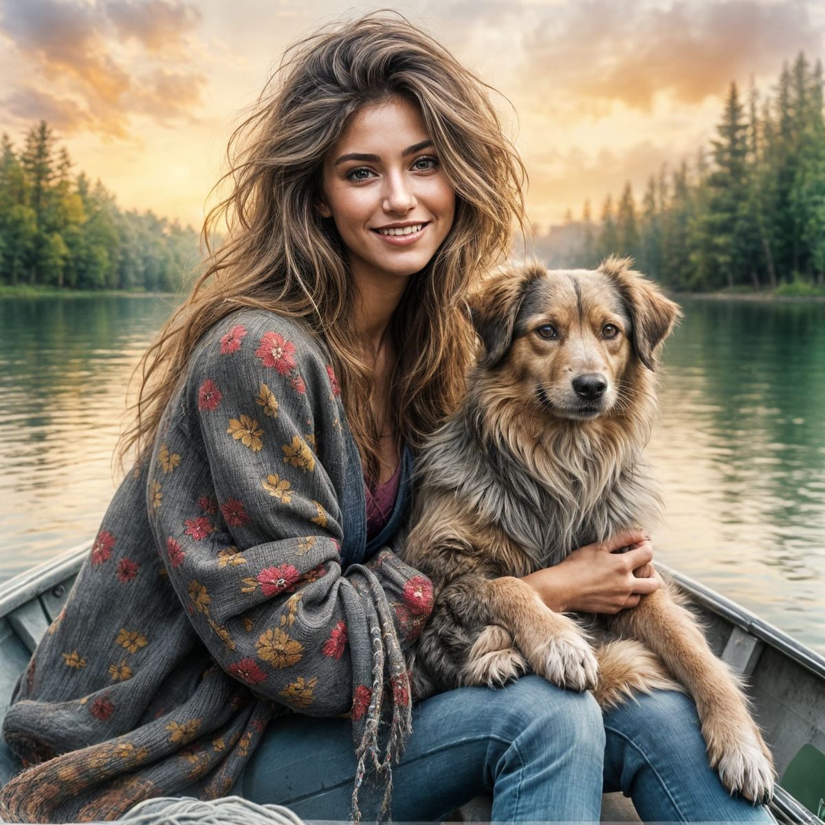 A serene image showing a beautiful woman on a paddle boat with her dog at sunrise. This portrait captures the tranquility of the moment with gentle brushstrokes and soft lighting, in an impressionistic style.