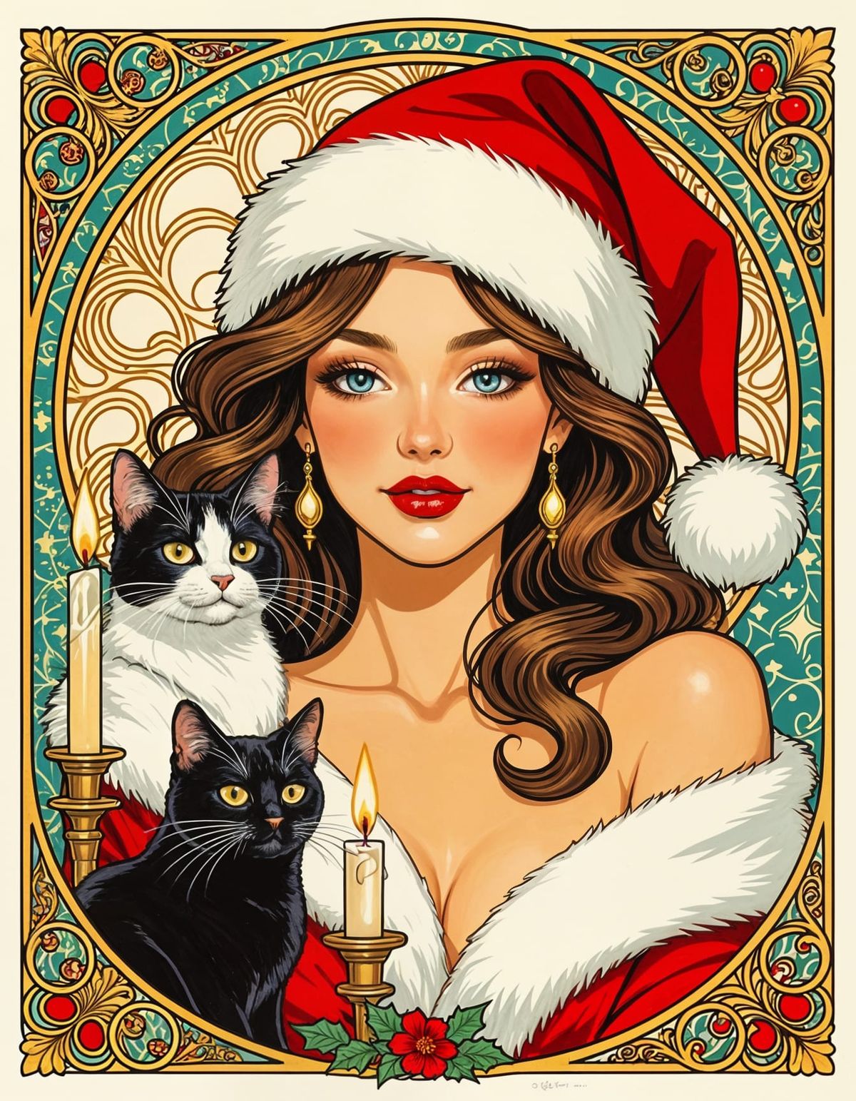 This image features stunning women in Santa hats with cats and candles, rendered in a vibrant, textured gouache style inspired by Art Nouveau and anime aesthetics.