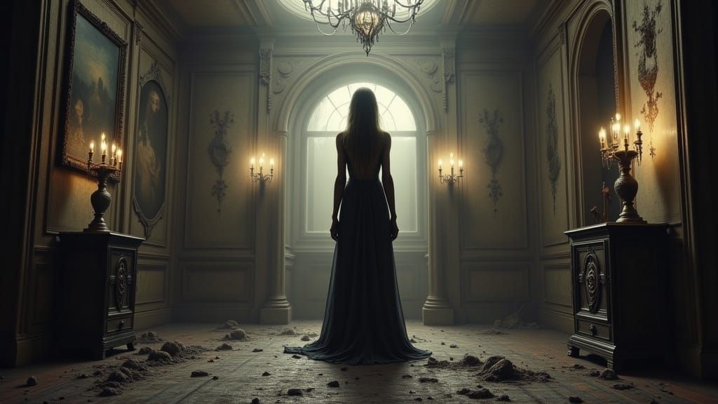 A surreal image of a woman with porcelain skin in a tattered gown, standing in an abandoned mansion with cobwebs and candelabras. The image is rendered in dark surrealism with a muted palette.