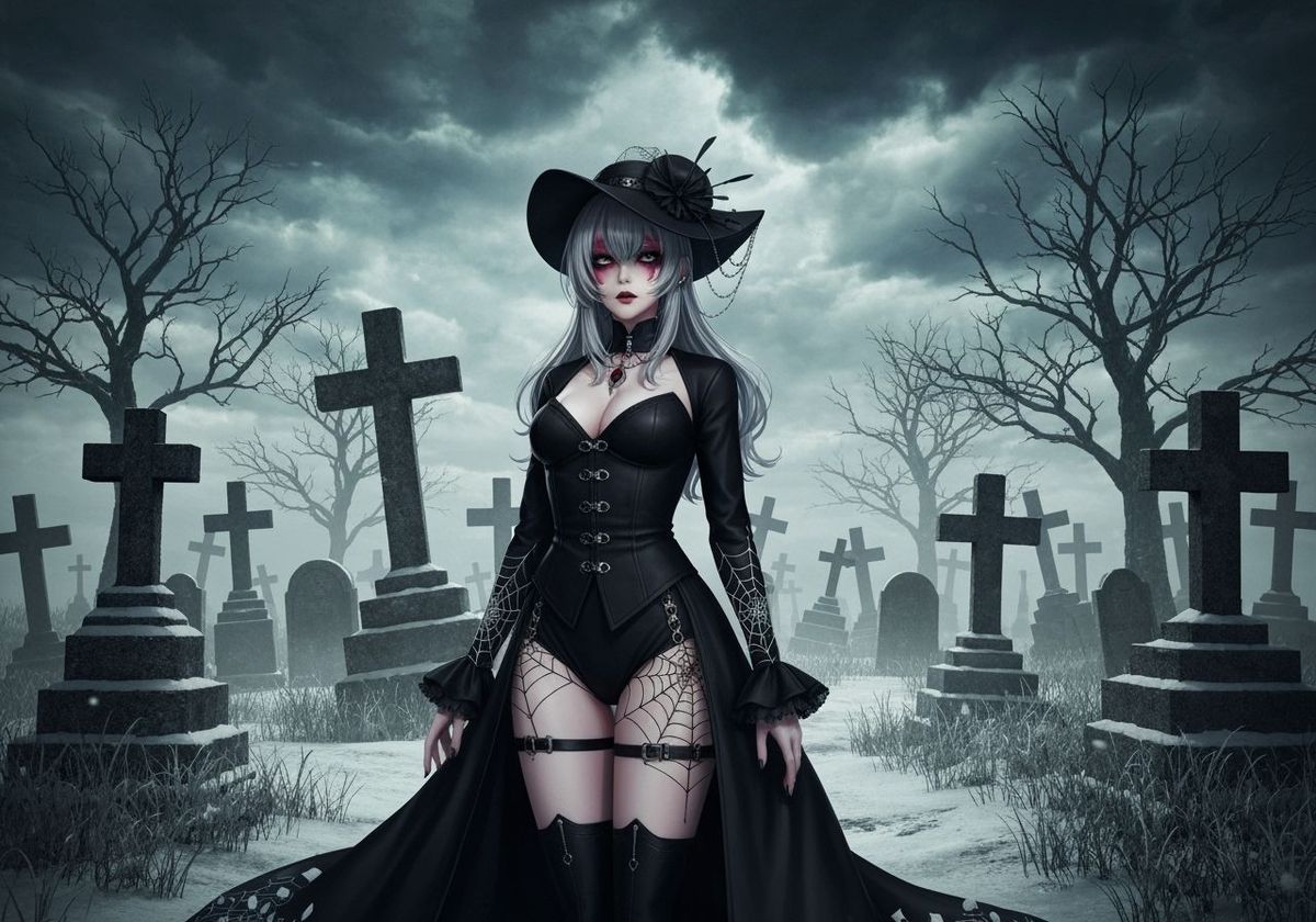 A 3D anime art style image of a gothic woman posing in a desolate winter graveyard. Features intricate details, dramatic makeup, and a dark, turbulent atmosphere.