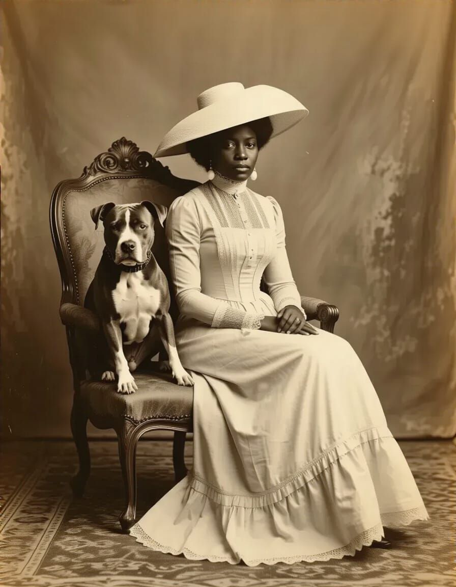 This image shows a vintage, sepia-toned photograph of an African American woman in a long dress and white hat, seated with a pit bull. The portrait evokes a warm, intimate atmosphere.