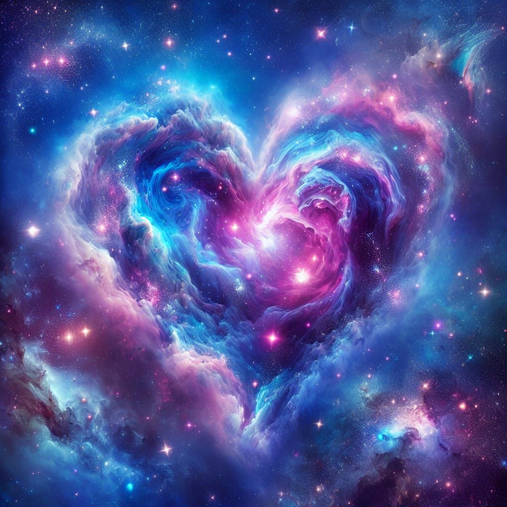 A vibrant image shows a heart-shaped nebula filled with swirling cosmic dust and stars. The nebula features blues, purples, and pinks, set against a backdrop of ethereal light and starfields.