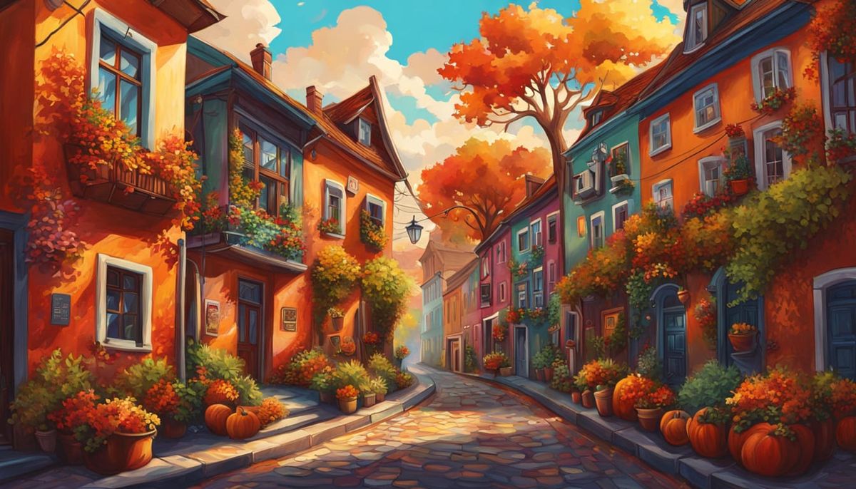 This image shows a vibrant village street in autumn, complete with colorful buildings, potted plants, and striking mural art. The artwork is rendered with textured brushstrokes and warm lighting, creating a polychromatic gouache painting.