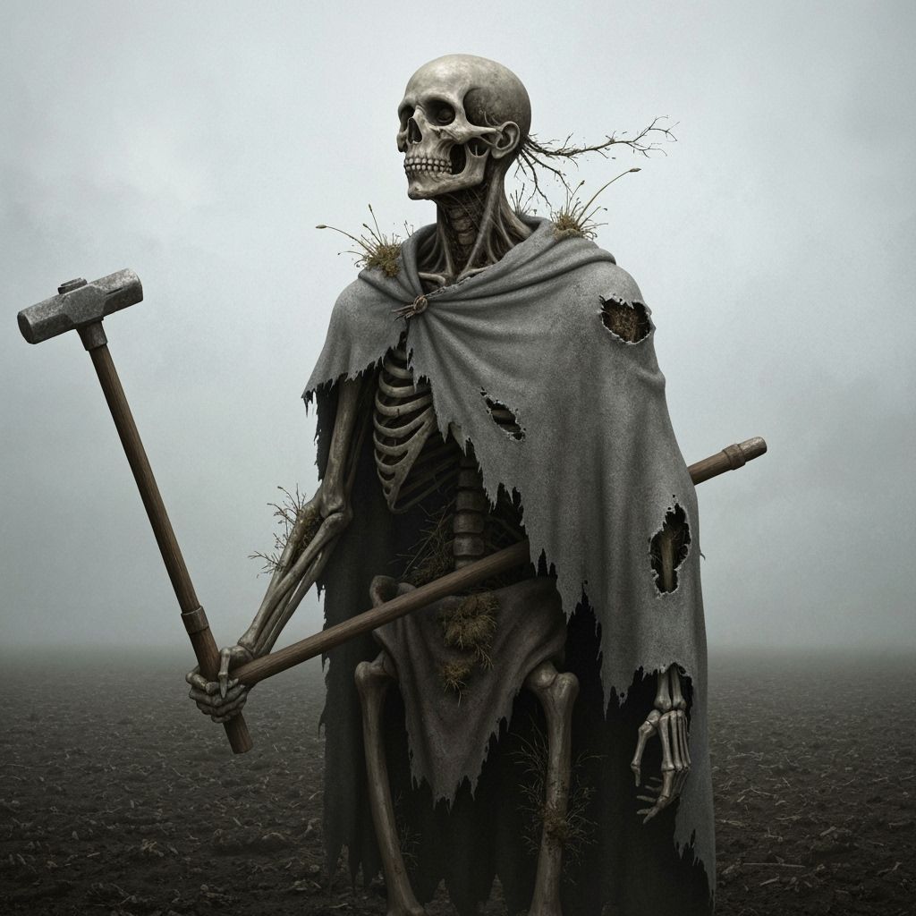 A haunting digital painting depicts a skeletal farmer with earth-caked bones, holding a strange farming tool. Atmospheric lighting and deep shadows enhance the desolate, cinematic scene.