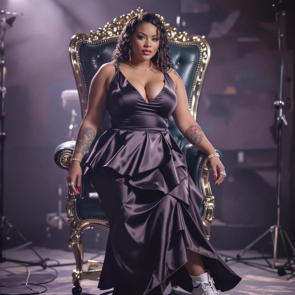 This image shows a charismatic, curvy, 20-year-old African-American rapper with blonde hair in a realistic studio setting. She is styled in a white shirt dress and high-top sneakers, enhanced with detailed tattoos and jewelry. The photo is highly detailed.