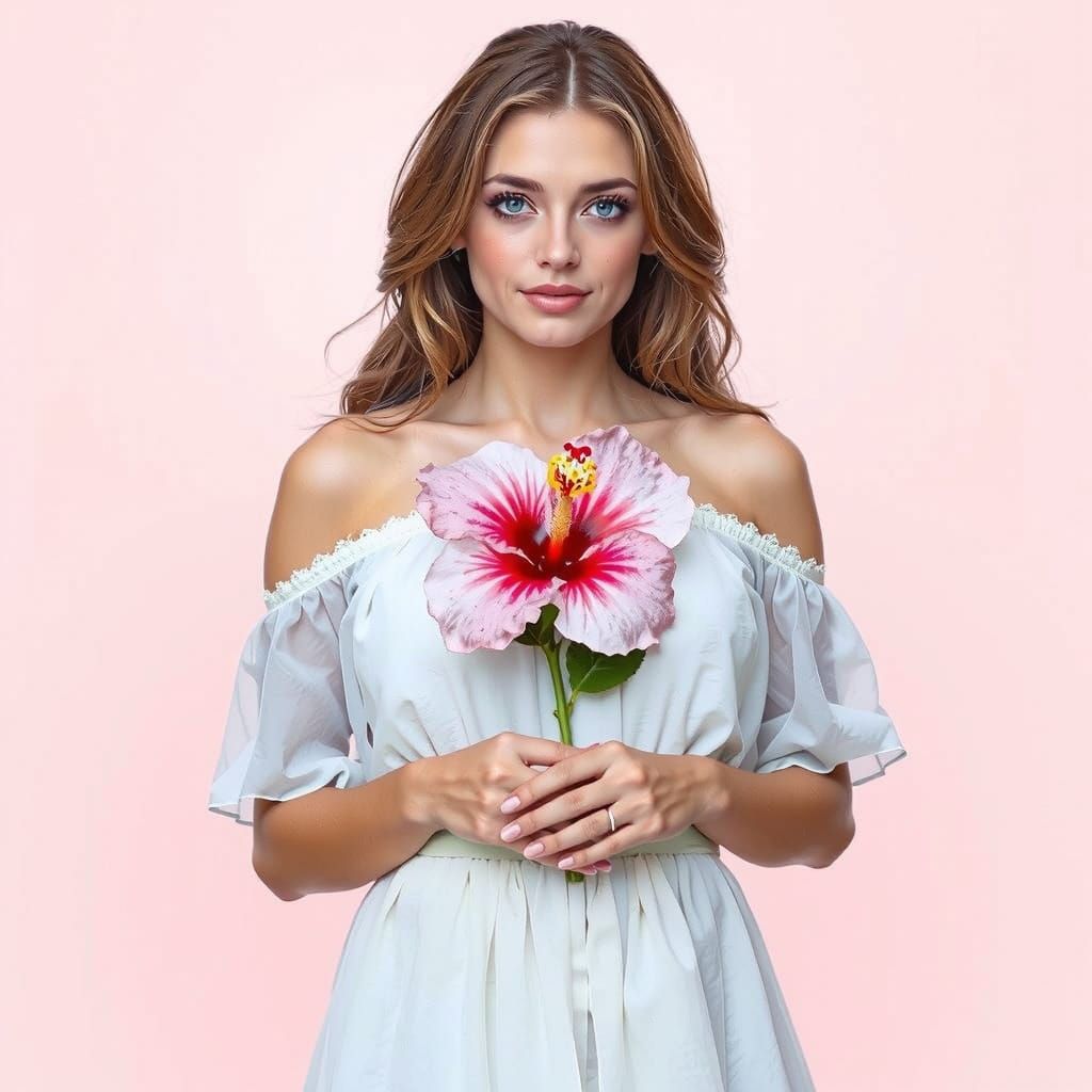 This image shows a beautiful woman holding a pink hibiscus. She has blue eyes and light brown hair, and is wearing a white dress. The art style is reminiscent of Art Nouveau illustrations.