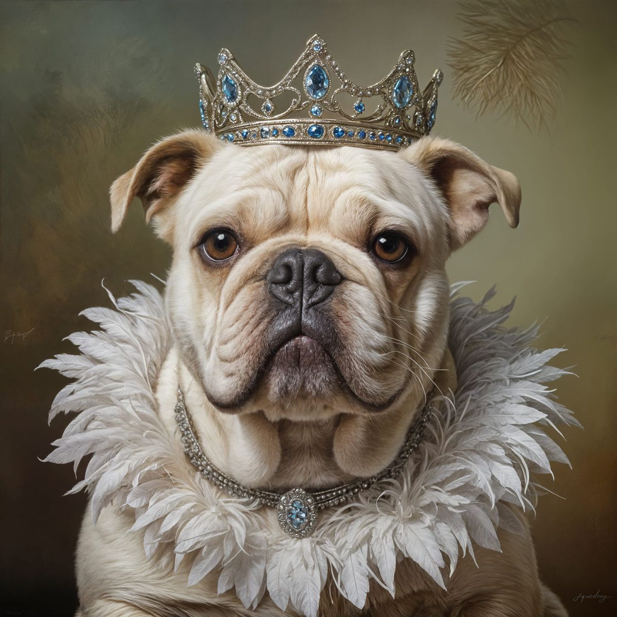 This image shows a charming bull dog dressed in regal attire, wearing a tiara and feather boa. The artwork is reminiscent of a whimsical oil painting by a renowned artist, blending humor and elegance in its depiction of a beloved pet.