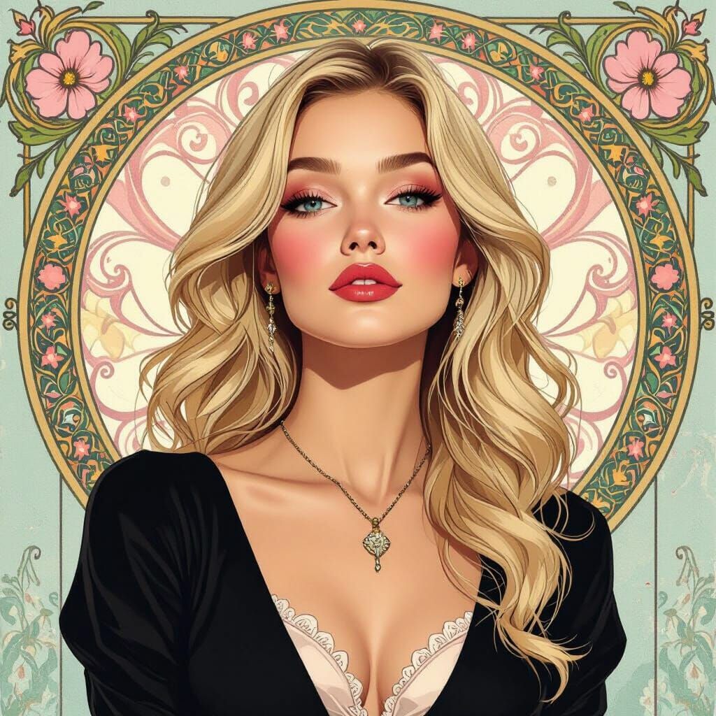 A digital portrait of a stylish blonde woman with pink highlights. The artwork evokes art nouveau aesthetics with realistic rendering and a pastel color palette.
