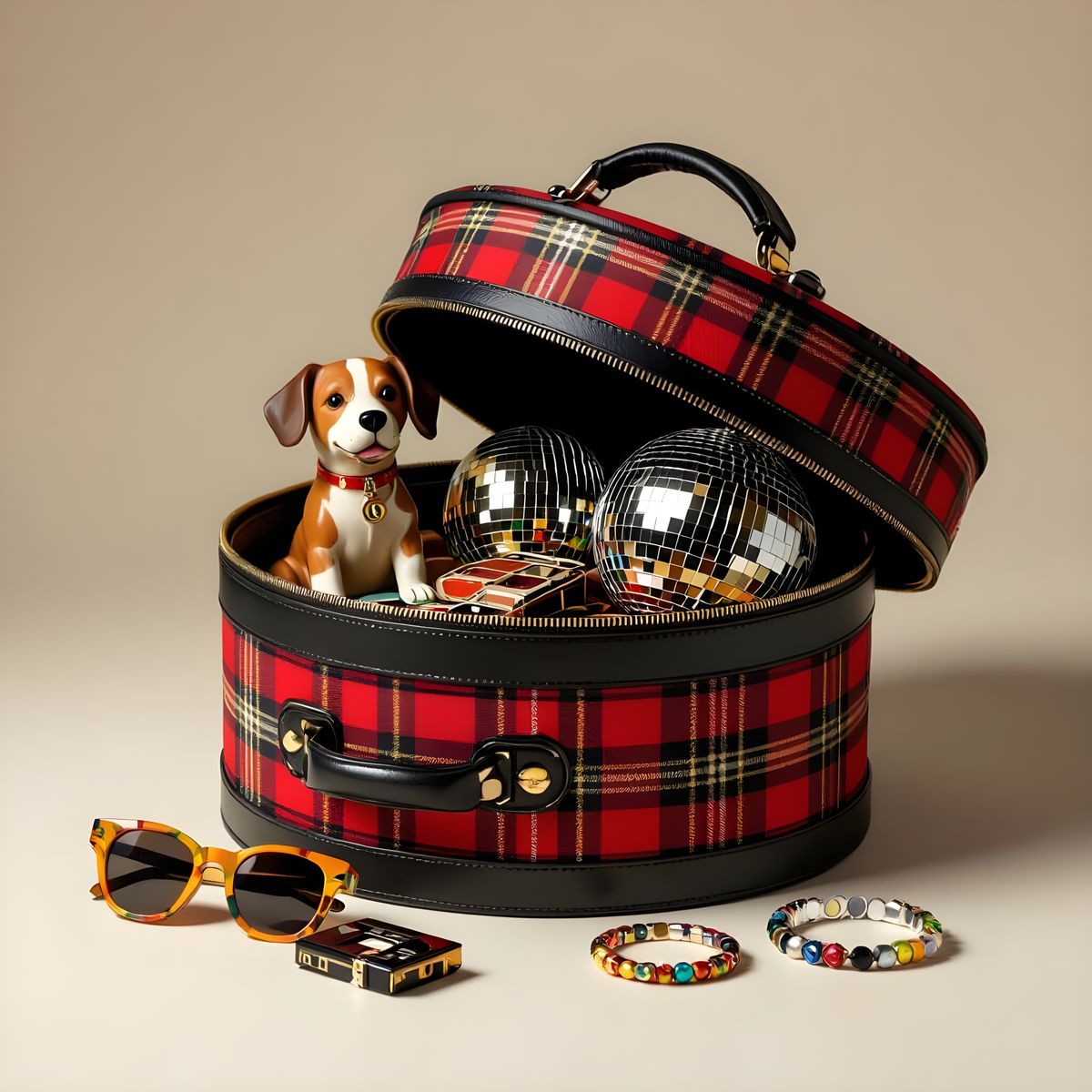 A photorealistic image of a vintage tartan hat box, partially unzipped to reveal travel-themed items spilling out. The composition features an RCA dog figurine, 80s sunglasses, and other retro accessories.
