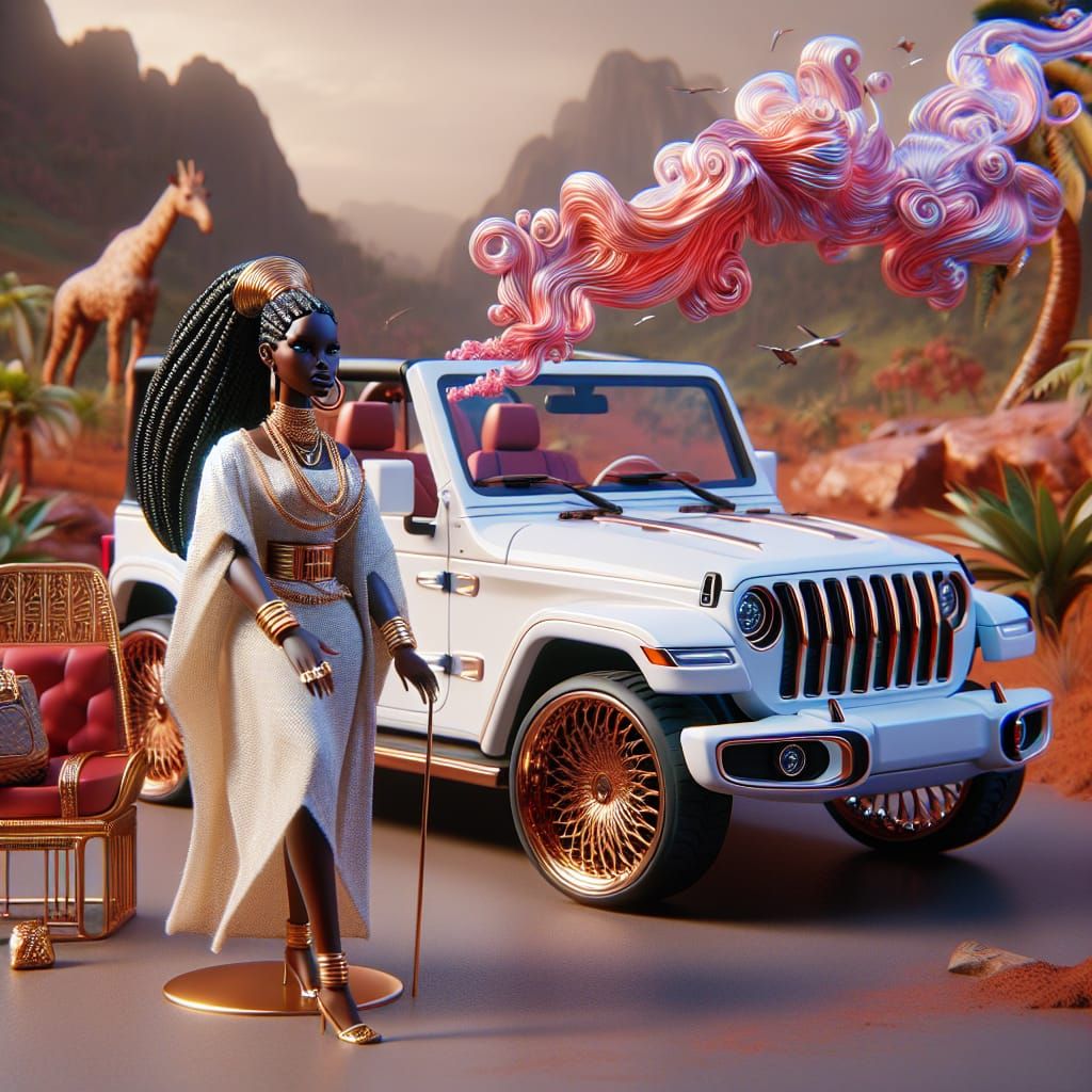 This image depicts a stunning African American adult doll with curves and long hair, surrounded by a fantastical jeep scene with a whimsical plume of smoke, showcased in a deep-colored, intricately detailed matte painting style.