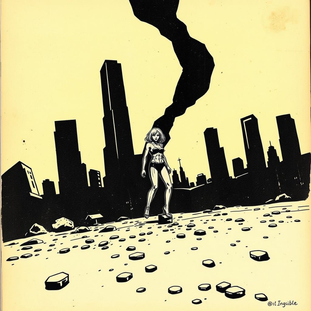 This image depicts a haunting scene of smoking ruins, reminiscent of a post-apocalyptic world, with a hint of surrealism and a touch of the avant-garde.