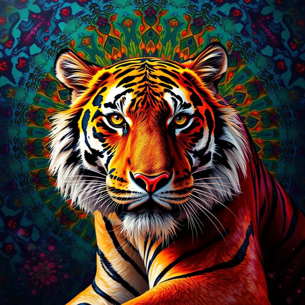 This image shows a hyperrealistic tiger in a dramatic, colorful, and detailed scene, reminiscent of museum-worthy masterpieces, with intricate textures and expressive brushstrokes, in a style blending Impressionist and Maximalist elements.