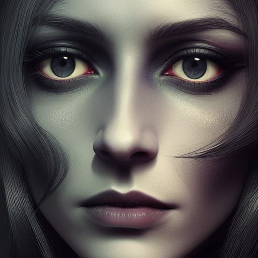 This haunting image depicts a mysterious female vampire in a dimly lit, abandoned cathedral. Moody colors and dramatic shadows create an eerie atmosphere, while intricate stone carvings add to the Gothic ambiance.