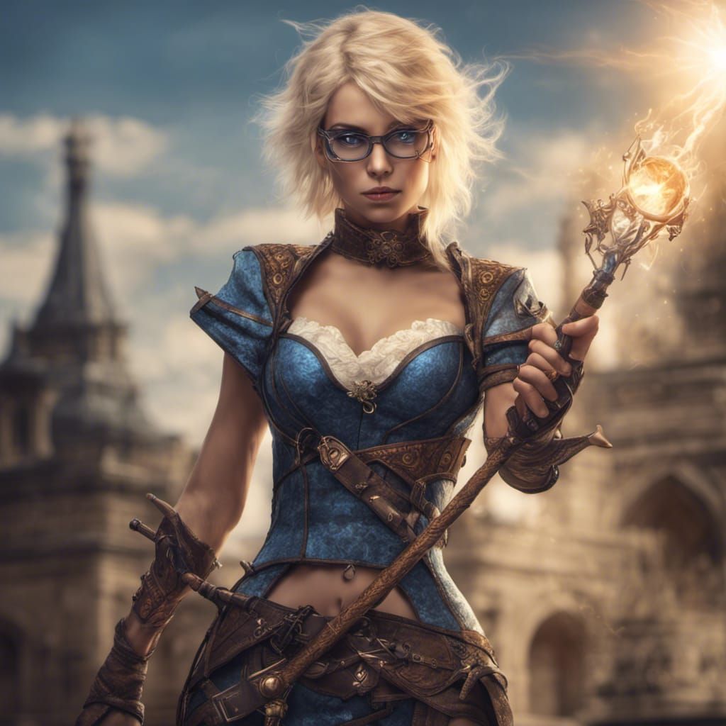 A hyperrealistic image of a half-elf sorceress with short blond hair and blue eyes. She wears noble attire with a corset, high boots, and glasses, and wields a glass staff crackling with lightning.