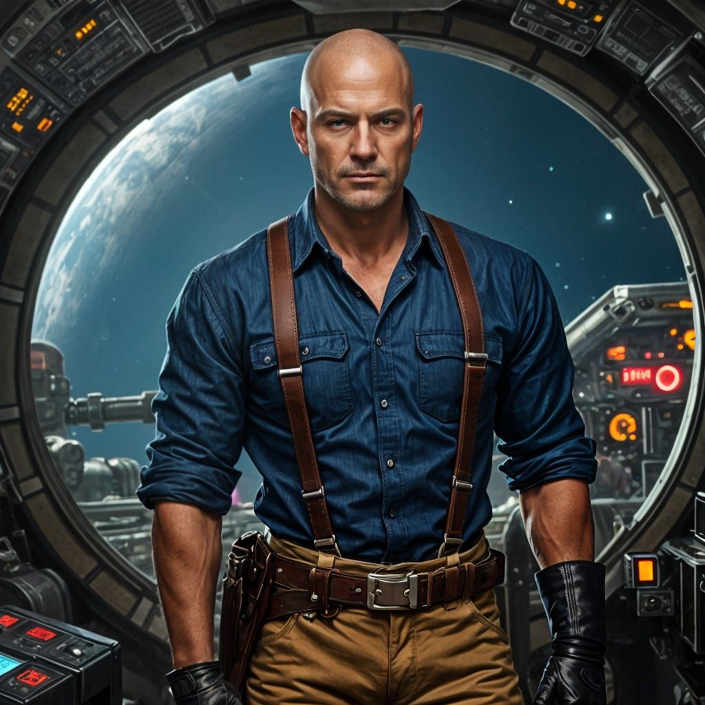 This image shows a stern middle-aged man with a shaved head and blue eyes, dressed in a mix of Western and futuristic attire. He stands in a sci-fi spaceship cockpit surrounded by illuminated instruments.