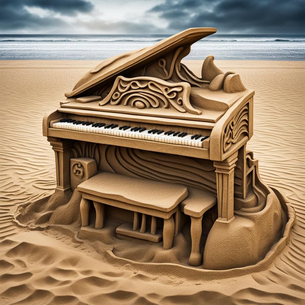 This image shows an elaborate sand sculpture of a piano on a beach during summer. The hyperrealistic image features intricate details, sharp focus, and high contrast, creating a cinematic and atmospheric mood.