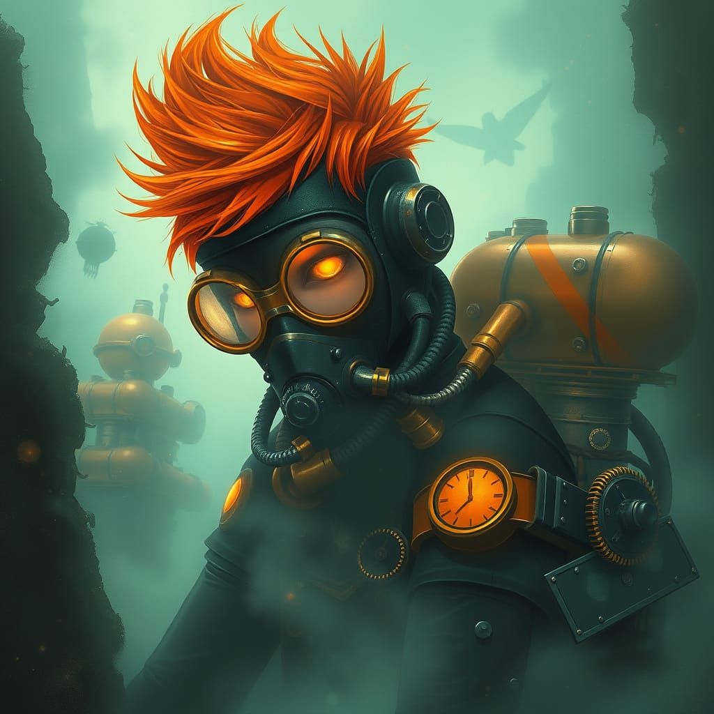 This image shows a dieselpunk diver with neon-orange hair in a clockwork diving suit exploring a misty, sunken city. The image has a cinematic and atmospheric feel, with a dark fantasy aesthetic.