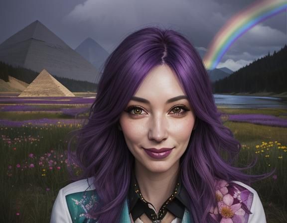 A vibrant portrait of a woman with purple hair, radiating a shining aura. The scene includes elements of nature and fantasy like a rainbow, moon, and pyramids in a colorful landscape.