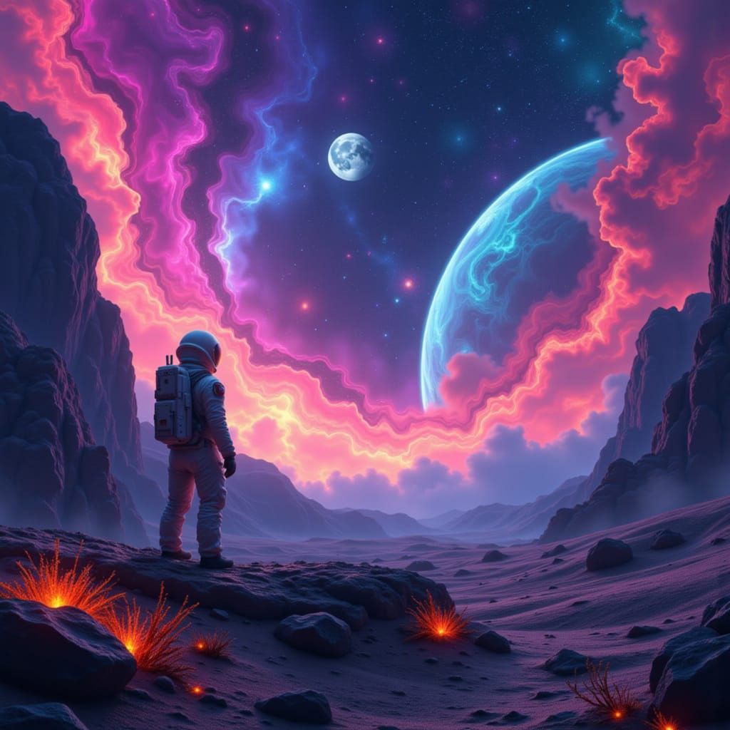 This image shows a surreal digital painting of an astronaut on a desolate alien world, gazing at a sky with two moons and glowing flora. Rendered in a cosmic, imaginative style.