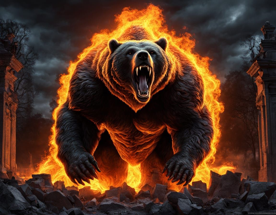 Obese Demonic fire Bear, Burning Nightmare Breathing Flames, dripping Rising, from volcanic fires of hell Inferno Magma leaping flaming rolling assail explosive