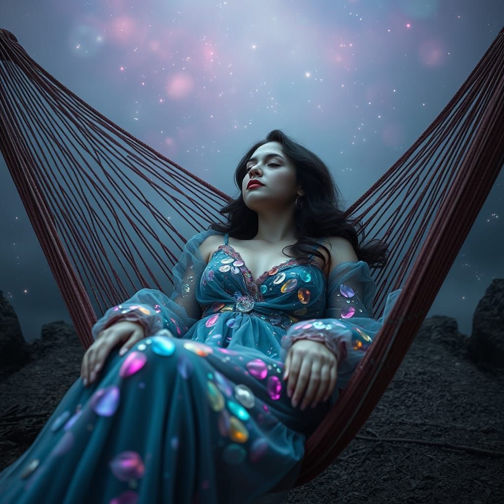 This image depicts a woman adorned in shimmering velvet, resting in a hammock amidst a surreal landscape of molten haze and spectral colors. It features a chromatic bloom and opal mist.