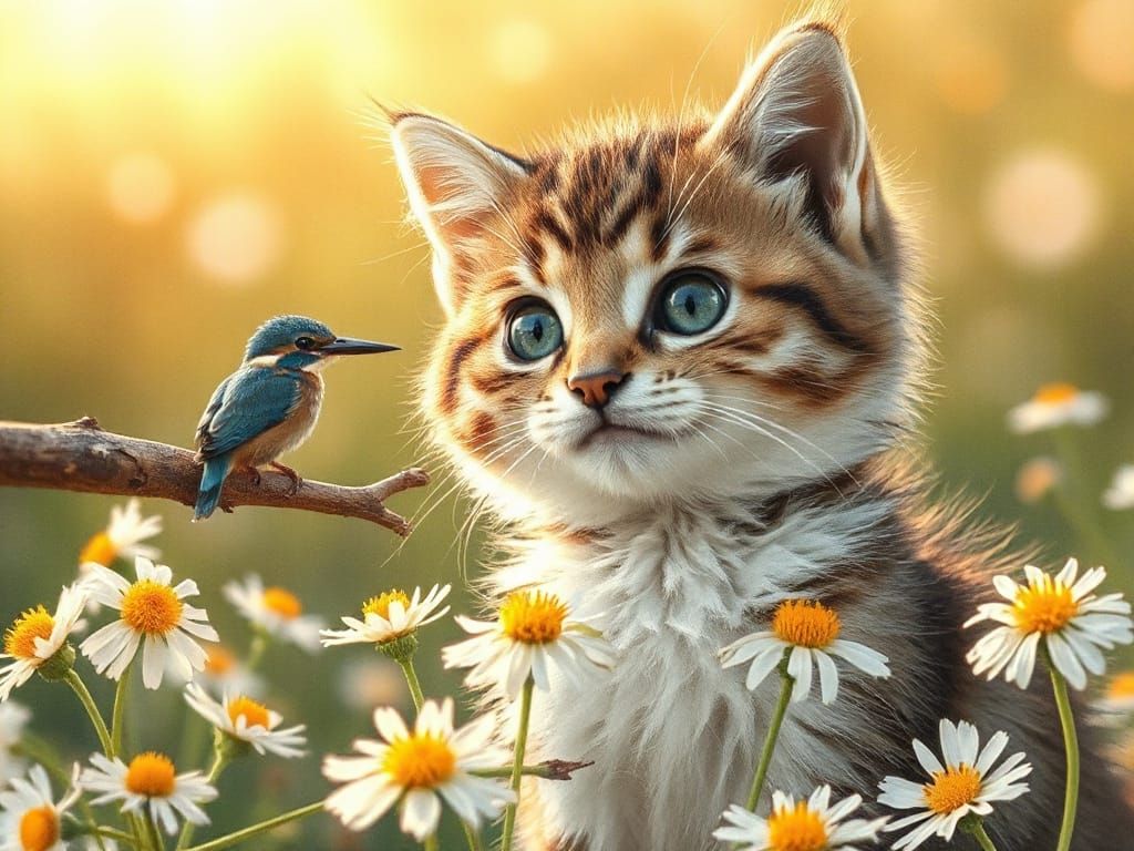 Cute Kitten Surrounded by Daisies Watching Beautiful Kingfisher