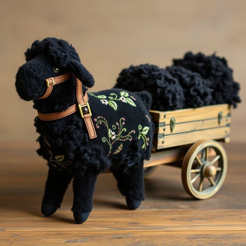 This charming image shows a plush black sheep wearing a tiny harness, pulling a wooden cart filled with soft black fleece in a style reminiscent of Beatrix Potter's whimsy and William Morris's earthy tones.