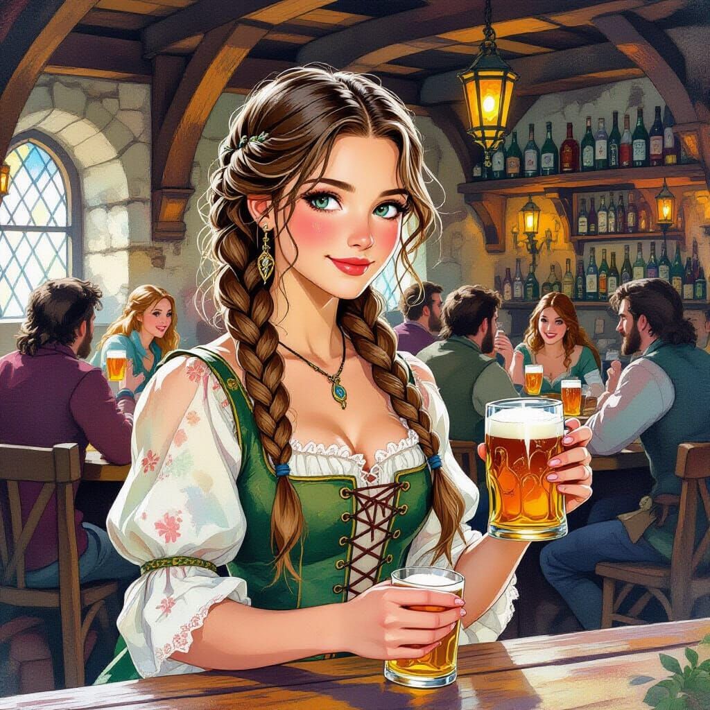 This image shows a woman in medieval dress serving ale in a tavern. The scene is rendered in a pastel watercolor style, featuring vibrant colors and elegant character design.