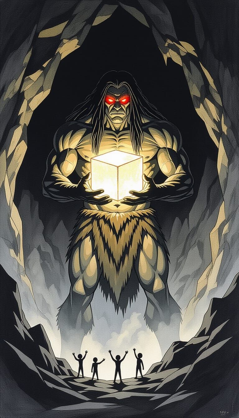 A striking charcoal drawing shows a giant, muscular figure with red eyes holding a glowing cube. Small figures below gaze up in awe from mountainous terrain.