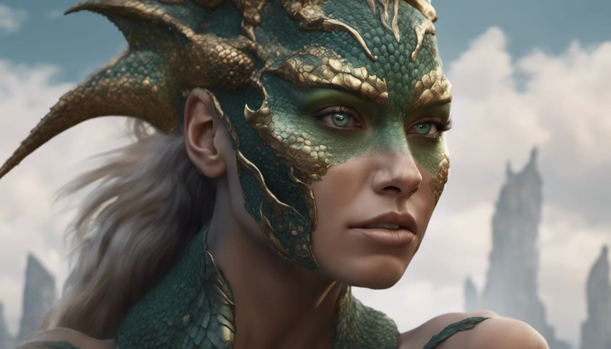 This image shows a reptile woman with golden hair, green eyes, and copper skin. She has dragon scale shoulders, rendered in deep color with intricate details as fantasy concept art.