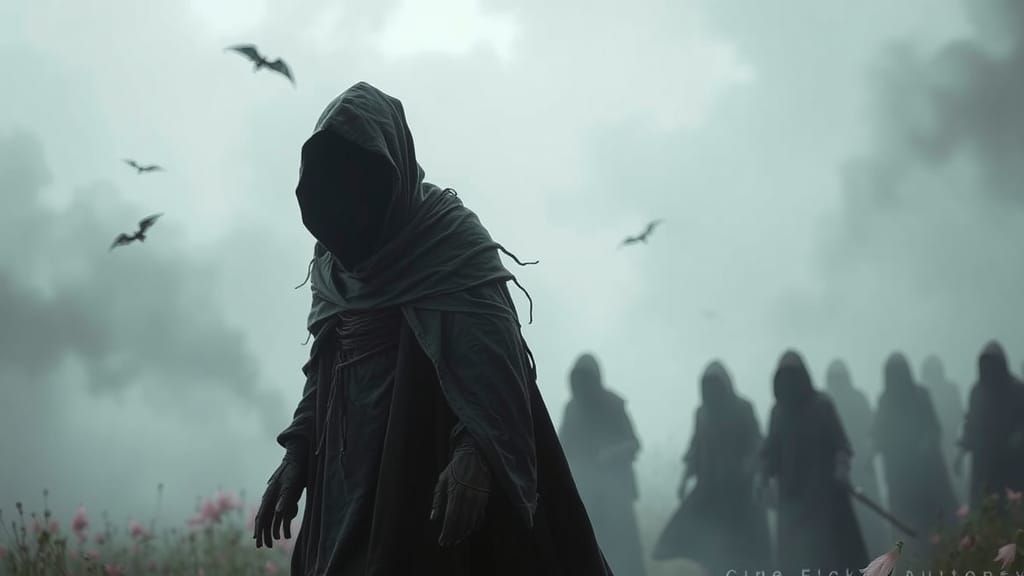 This image shows a solemn Grim Reaper leading spirits to the afterlife. The scene is set in a dreamy, ethereal atmosphere with soft lighting and a muted color palette, reminiscent of cinematic photography.