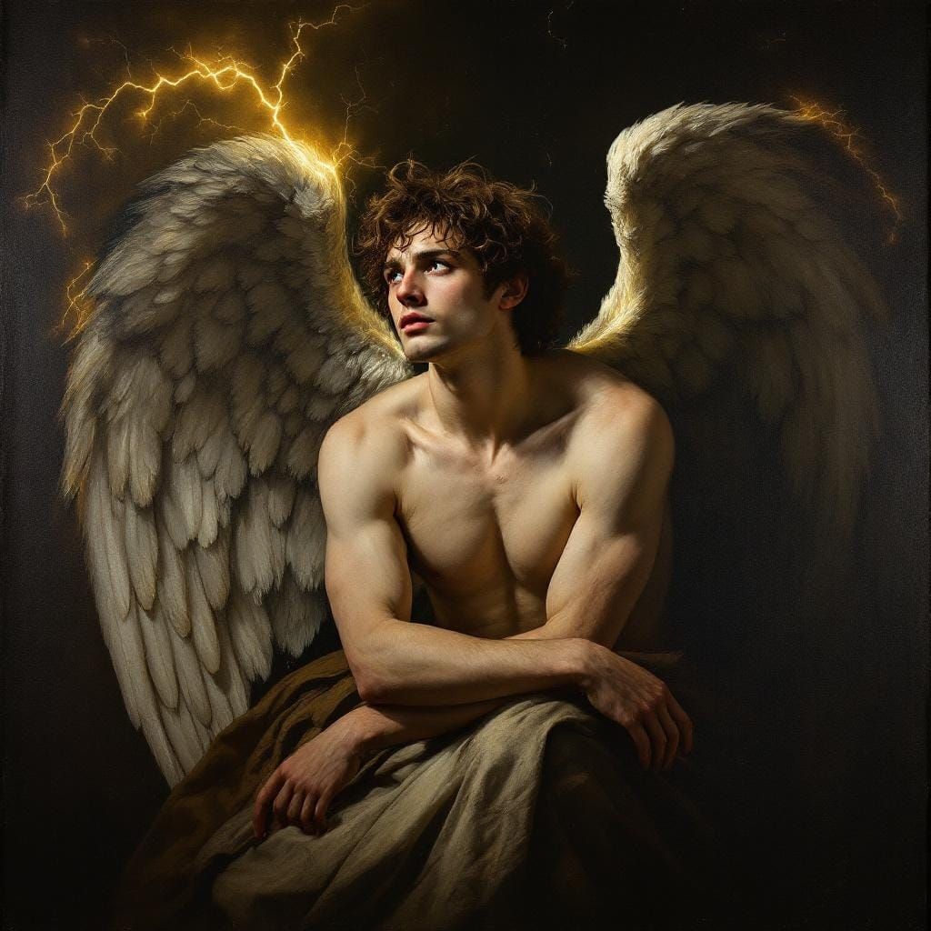 A dramatic portrait of an angel with unfurled wings against a backdrop of bright lightning. The image evokes chiaroscuro through light and shadow, reminiscent of Baroque and Renaissance painting.