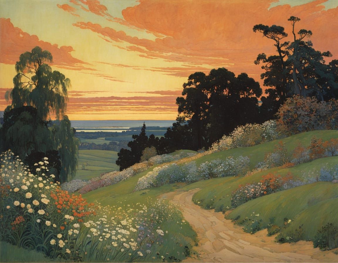 This enchanting image showcases a serene landscape reminiscent of classic illustrations by renowned artists, blending fantasy and realism in a dreamy, ethereal aesthetic.