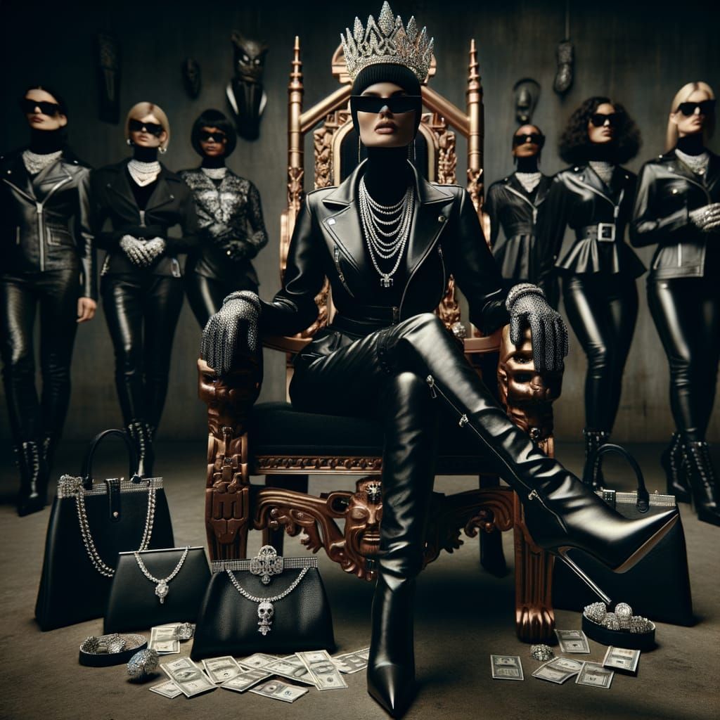 This image shows a bandit queen on her throne, dressed in black leather and diamonds. Her lieutenants flank her as devoted subjects kneel before her, offering tribute. The image has a film noir aesthetic.