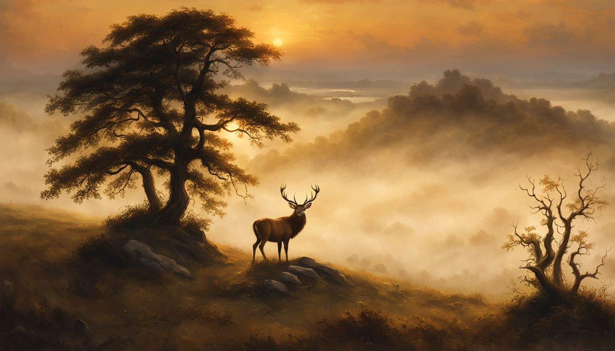 A striking picture of a stag standing on a misty hilltop at dawn. The soft, golden light and warm, earthy tones create a serene and mystical atmosphere reminiscent of classical oil paintings.
