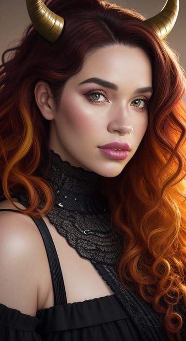 A close-up portrait of a woman with striking features, including horns, vibrant curly hair, big lips, and a curvy figure, captured in studio lighting with bokeh and golden hour effects.