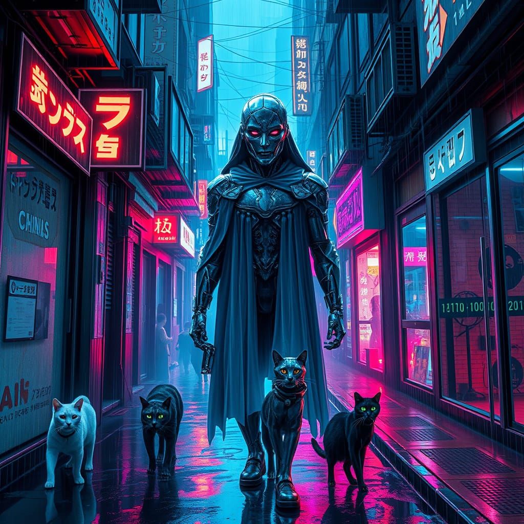 A striking picture of a neon-lit alley in a futuristic city. A ghostly figure in chrome armor floats through the rain-slicked alley, rendered in a cyberpunk aesthetic.
